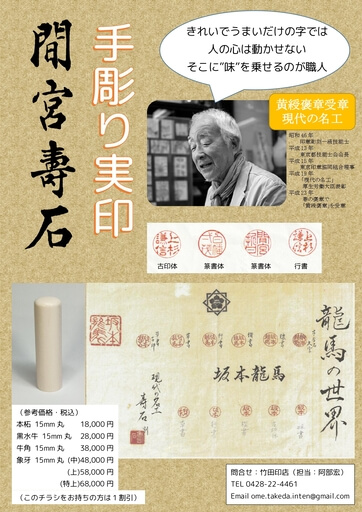 「間宮寿石の手彫り実印」に関するお申込み・お問い合わせは、ホームページの「お問い合わせ」、または電話(0428-22-4461)で。