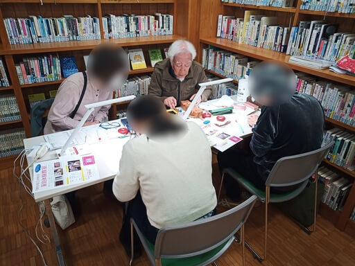 ワークショップはことばランド1階の図書室で行いました。周りを本で囲まれたなかでの篆刻は、いつもと変わった雰囲気でした。同じ部屋では他のワークショップも行われていて、にぎやかな環境でした。