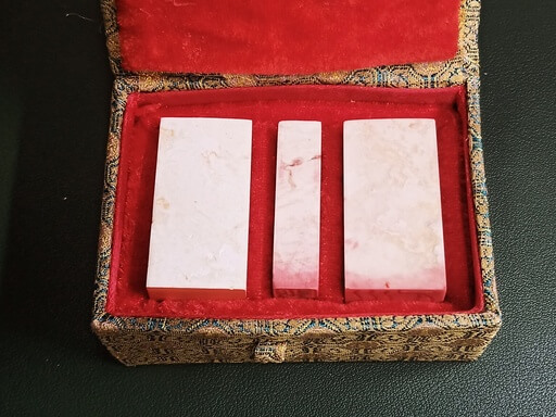それでも引首印は、印面が長方形の印材を使うことが多く、縦横比は2:1が多く見られます。それは氏名印、雅号印と合わせて同じサイズでそろえることが多いためです。この3つを三顆印(さんかいん)と言います。例えば24ミリ角の氏名印(白文)であれば、同じ24ミリ角の雅号印(朱文)にして、更に縦24ミリx横12ミリの引首印をそろえると縦が24ミリで揃うので印箱に納まりが良いです。