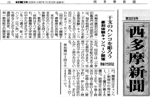 今年も「西多摩新聞2025.11.14」号で、当店の「篆刻体験教室」が紹介されました。(昨年記事のはこちら)