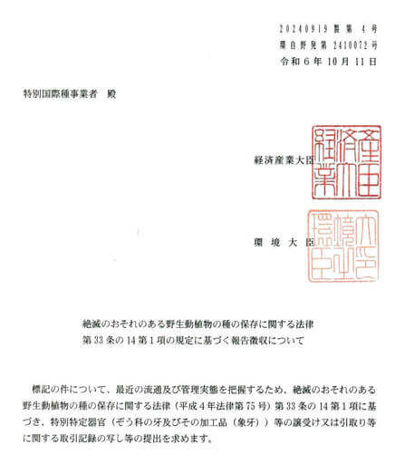 その他象牙製品を取り扱う事業者は、種の保存法に基づき「特別国際種事業者登録」を行わなければなりません。また記載台帳を5年間保存し、環境大臣及び経済産業大臣の求めに応じて提出する義務があります。